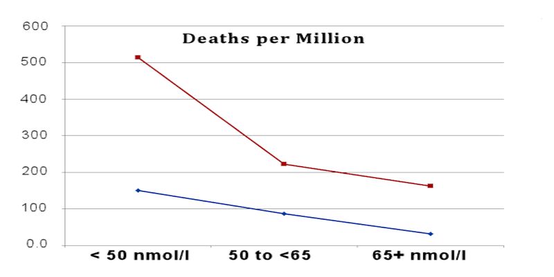 Este artigo revisa e atualiza um estudo publicado anteriormente: Ilie, Petre Cristian, Simina Stefanescu e Lee Smith. “O papel da vitamina D na prevenção da doença coronavírus em 2019, infecção e mortalidade. ”Pesquisa Clínica e Experimental sobre Envelhecimento (15 de abril de 2020): 1. [7] Link PDF | Link da página da webIlie et al. descobriram que “níveis médios de vitamina D em vários países” estavam associados a “casos e mortalidade causados por COVID-19”. Para nações com baixos níveis de vitamina D na população em geral, casos por milhão de pessoas e mortes por milhão de pessoas foram ambos significativamente mais elevados do que para nações com níveis mais altos de vitamina D. O nível de vitamina D necessário para o caso mais baixo e as taxas de mortalidade estavam em o limite inferior da faixa normal.